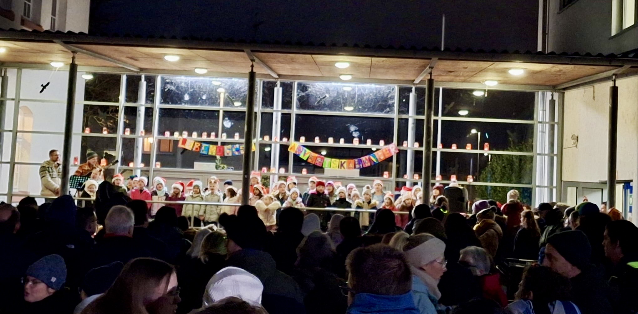 Am vorvergangenen Mittwoch war es wieder soweit: Die Gemeinde übergab das Licht des lebendigen Adventskalenders an die Lindenschule. Nach einer kurzen Ansprache von Schulleiter Christian Neunert füllte sich die eigens aufgebaute Bühne mit den Kindern der Schule. Mit roten Weihnachtsmützen ausgestattet sangen sie gemeinsam Weihnachtslieder und trugen Gedichte vor.