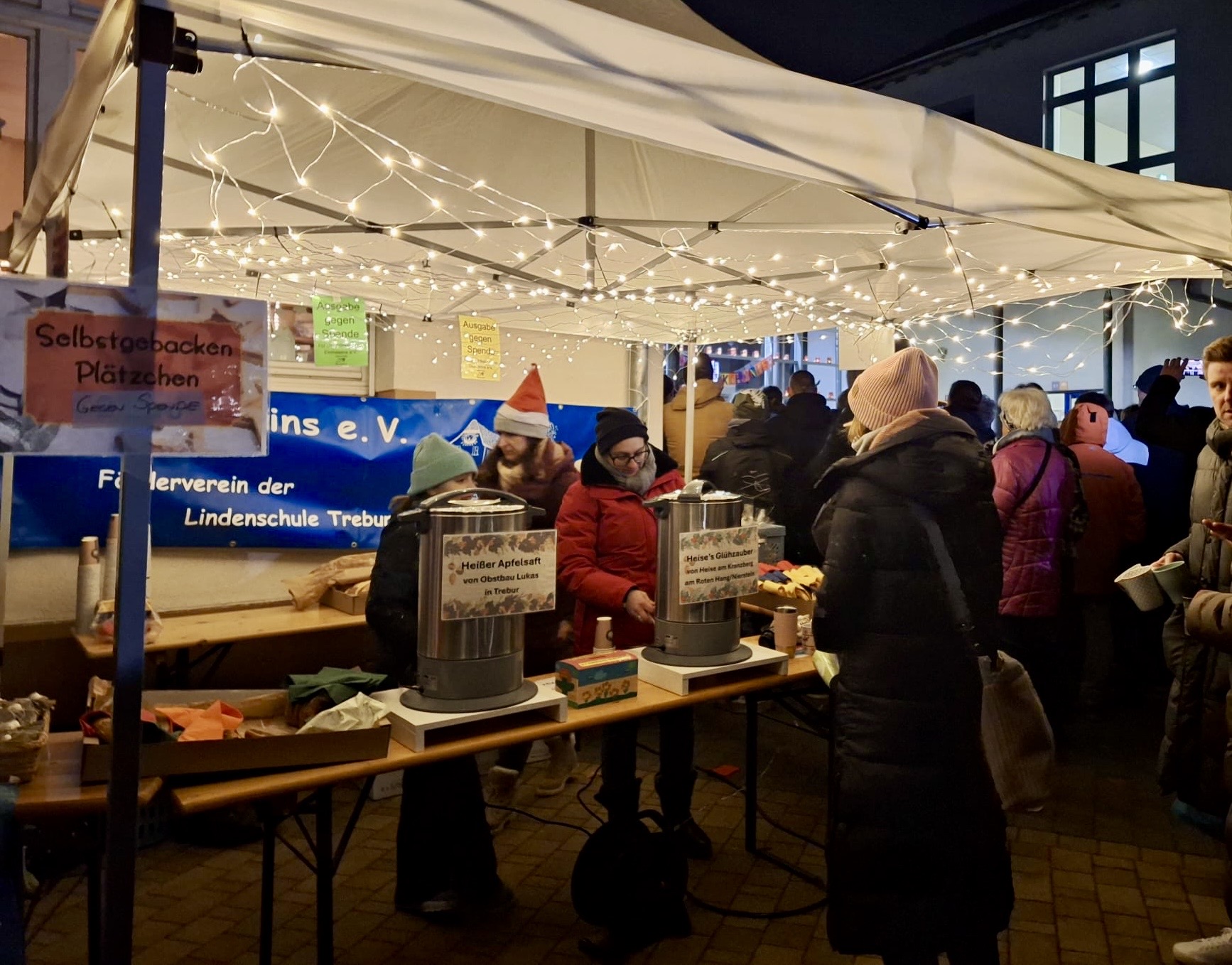 Die zahlreich erschienenen Eltern, Großeltern und weiteren Angehörigen lauschten andächtig und ließen sich bei winterlich kühlen Temperaturen Glühwein und heißen Apfelsaft schmecken. Beides wurde traditionell am Stand des Fördervereins Einmaleins der Lindenschule ausgeschenkt, wo auch die von den Klassen gebackenen Plätzchen reißenden Absatz fanden.